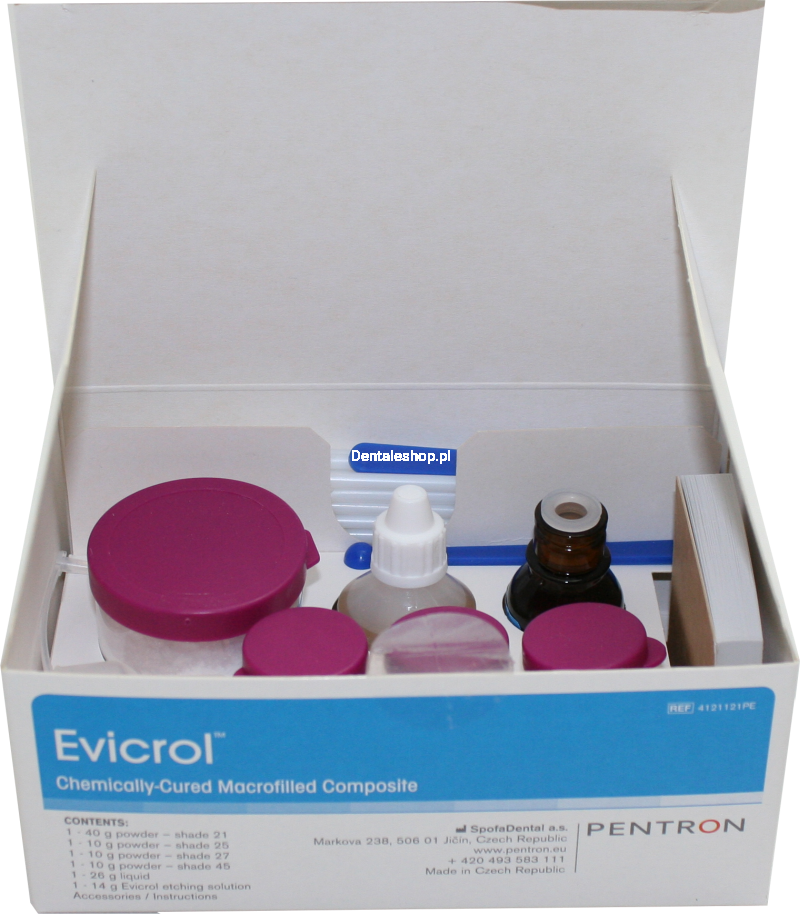 Balení: 1 x 40 g prášku v základním odstínu č. 21, 3 x 10 g prášku v doplňkových odstínech č. 25, 27, 45, 1 x 26 g tekutiny, 1 x 14 g Evicrol leptací roztok, míchací podložka, 2 odměrky prášku