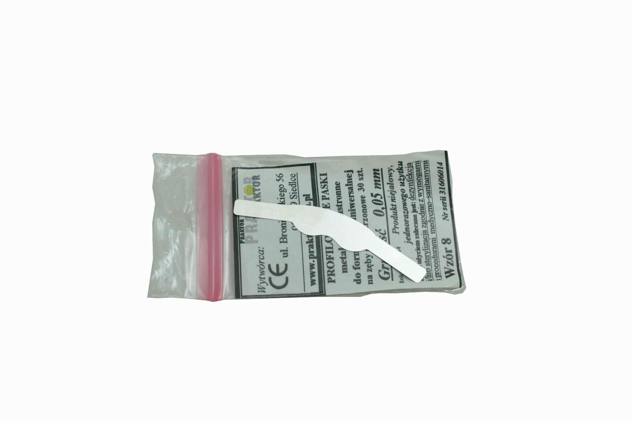 Profilované kovové pásy na obou stranách pro univerzální matrici pro premoláry . Nesterilní, na jedno použití. Tloušťka 0,05 mm.