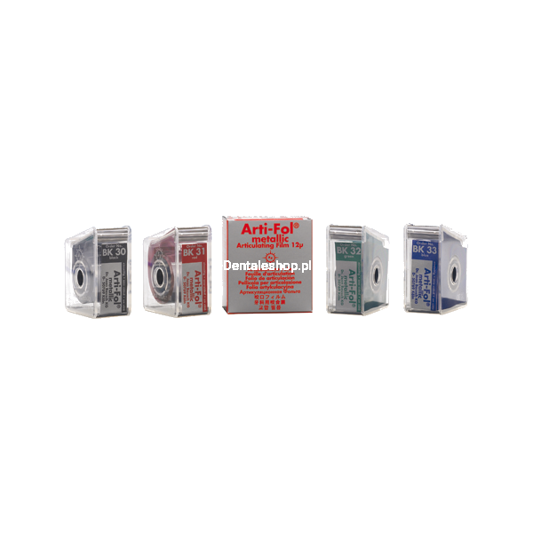 Arti-Fol® Metallic 12μ is a high-tech control film with significantly improved properties. This control film consists of a metallised polyester film (Shimstock film) with a thin thickness of 12μ. The combination of a dye layer and a metallised polyester film has clear advantages in some applications. The foil is characterized by very good dye transfer. Particularly on porcelain and polished metal surfaces, the contact points are clear. Thanks to the use of metallised foil, the problem of static electricity has been largely eliminated. The foils can be easily applied without tweezers. The material is also very resistant to tearing and therefore can be successfully used to control the chewing surface of the tooth. Unlike traditional metallic foils, Arti-Fol® Metallic marks precisely the contact points. Thanks to the metallised reverse side of the foil, the side with the dye layer is easy to distinguish. Arti-Fol® Metallic, thanks to its high tensile strength and low material thickness, is ideally suited for the control of contact points when placing bridges or crowns. With the new Arti-Fol BK 145 tweezers, the foil can be easily applied to the contact points. Arti-Fol® Metallic is available in four colors. With the new Arti-Fol BK 145 tweezers, the foil can be easily applied to the contact points. Arti-Fol® Metallic is available in four colors. With the new Arti-Fol BK 145 tweezers, the foil can be easily applied to the contact points. Arti-Fol® Metallic is available in four colors.