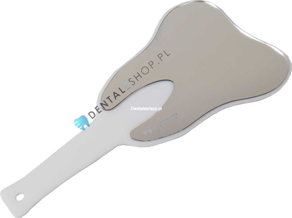 Tooth-shaped mirror measuring 14x27 cm (with handle). The mirror is made of unbreakable material.