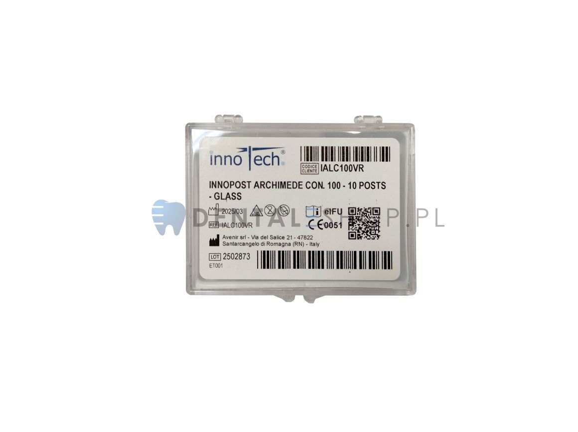 Linka InnoPost Archimede jedná sa o kvalitnú korunkovo-koreňovú vložku zo sklolaminátu, určenú pre modernú rekonštrukciu zubov po endodontickom ošetrení. Vďaka svojmu kužeľovitému tvaru prispôsobenému anatomickej štruktúre koreňového kanálika vám systém Archimede Line umožňuje udržiavať maximálne množstvo zdravých tkanív, pričom zabezpečuje stabilitu a dlhodobú trvanlivosť rekonštrukcie.